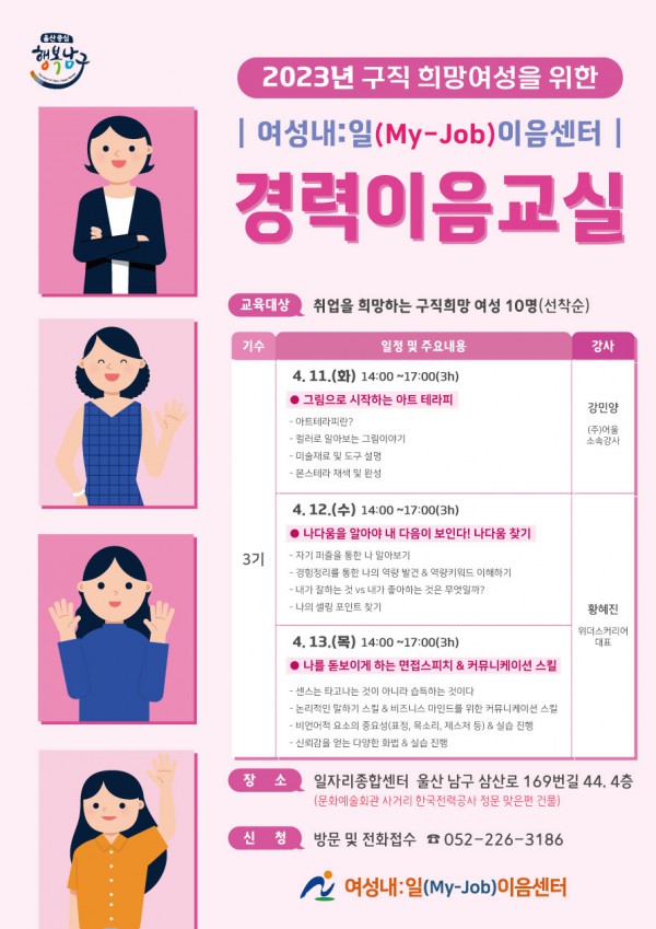 울산 남구 여성내일이음센터에서는 구직희망여성들을 위한 취업역량강화교육을 운영하오니 많은 관심과 참여바랍니다.