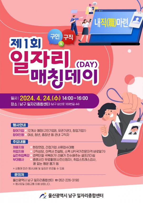 울산광역시 남구에서는 기업에게 우수 인재 채용의 기회 마련과 지역의 구인난 해소를 위해 2024년 <제1회 일자리 매칭데이>를 개최합니다.