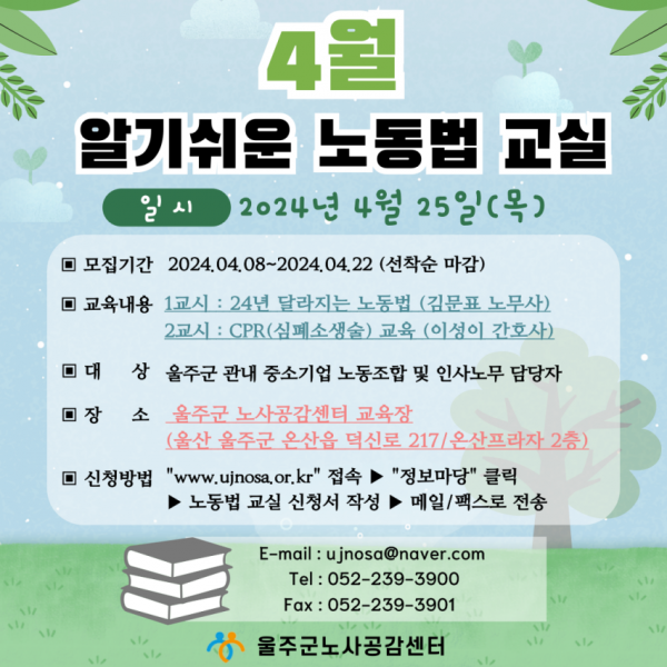 - 내 용 : (1교시) 2024년 달라진 노동법 / (2교시) CPR 심폐소생술 교육