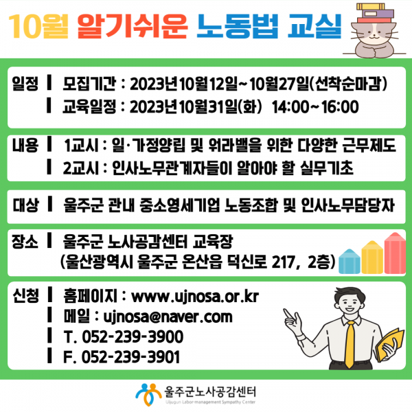 울주군 노사공감센터에서 연중 노동법 교육지원 사업으로 일가정양립 및 워라밸을 위한 다양한 근무제도, 인사노무관계자들이 알아야 할 실무기초를 주제로 울주군 관내 사업장 인사노무담당자를 대상으로 노동법 교육프로그램을 운영하오니 많은 관심과 참여 바랍니다.