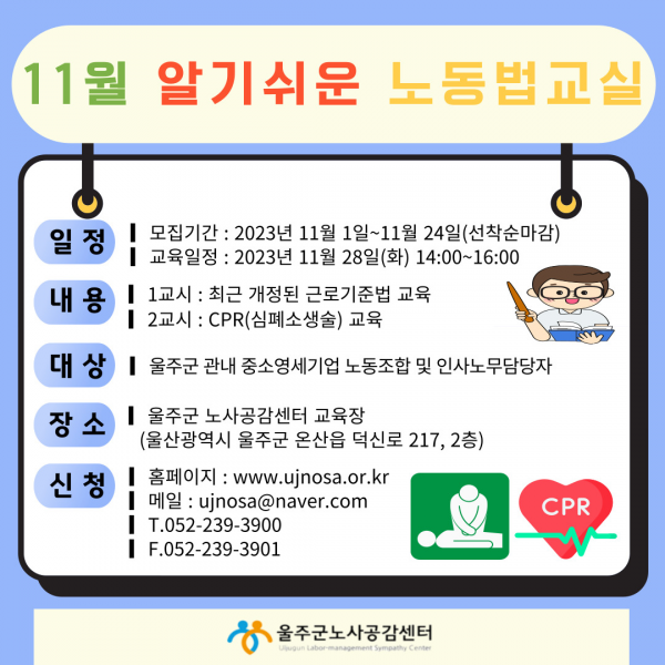 울주군 노사공감센터에서 연중 노동법 교육지원 사업으로 최근 개정된 근로기준법 교육, CPR(심폐소생술)교육 이라는 주제로 울주군 관내 사업장 인사노무담당자를 대상으로 노동법 교육프로그램을 운영하오니 많은 관심과 참여 바랍니다.