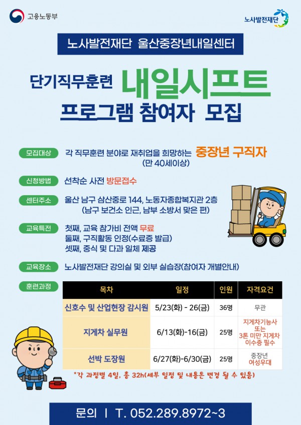 - 지게차 실무원 : 6/13(화)~16(금), 25명 *지게차기능사 또는 3톤 미만 지게차 이수증 필수