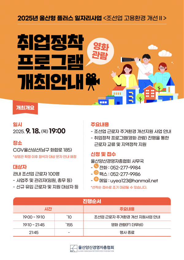 이와 관련하여 본 사업 설명회와 연계한 취업정착프로그램(영화관람)을 개최하오니 많은 관심과 참여 바랍니다.