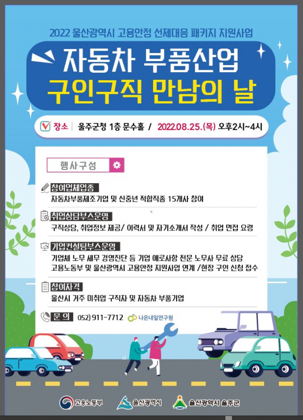 <자동차 부품산업 구인구직 만남의 날> 행사가 개최되오니 기업 및 구직자 여러분의 많은 관심과 참여 바랍니다.