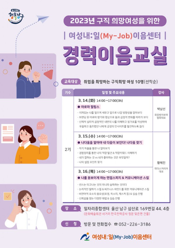 울산 남구 여성내:일(My Job) 이음센터에서는 구직희망여성들을 위한 취업역량강화교육을 운영하오니 많은 관심과 참여 바랍니다.