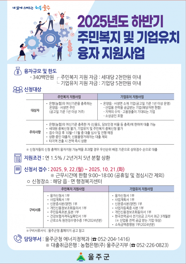 울주군 에너지정책과에서 주관하는 「2025년 하반기 주민복지 및 기업유치 융자 지원사업」 안내드리오니 관심 있는 분들께서는 신청하시기 바랍니다.