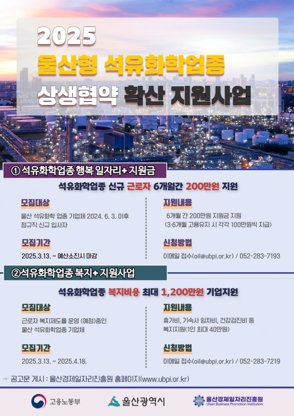 울산경제일자리진흥원은 석유화학업종 원하청 이중구조 개선 및 상생협력 문화확산을 위하여 2025년 석유화학업종 상생협력 확산지원사업을 추진하고 있습니다.