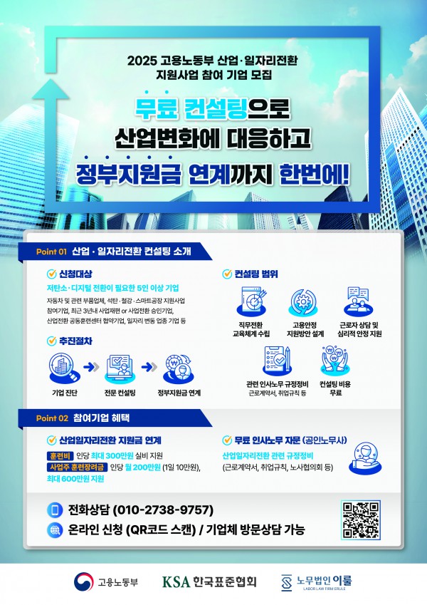 고용노동부에서 시행하는 <2025년 산업·일자리전환 지원사업> 참여기업을 모집하오니 많은 관심과 참여 바랍니다.