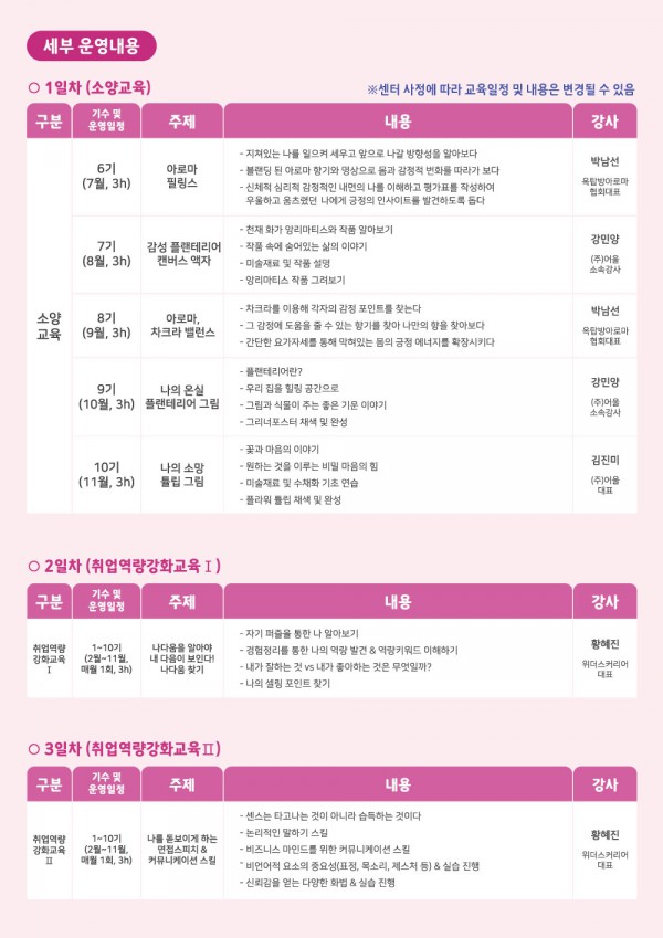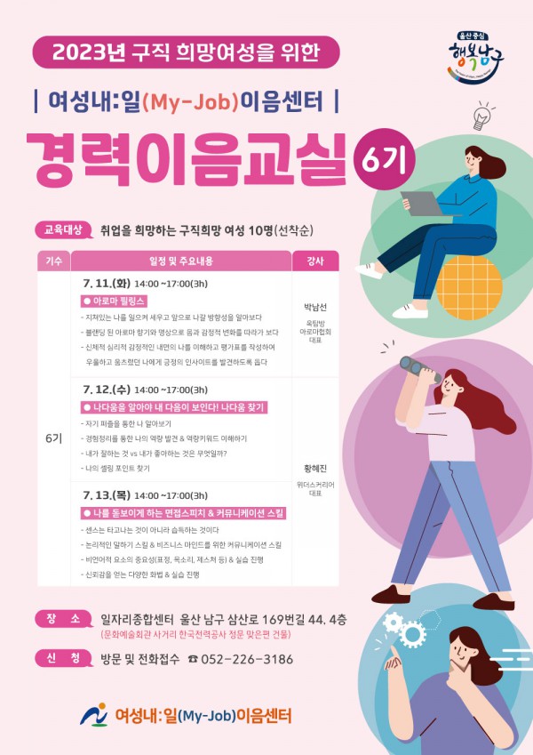 울산남구 여성내일이음센터에서는 구직희망여성들을 위한 취업역량강화교육을 아래와 같이 운영하오니 많은 관심과 참여 바랍니다.