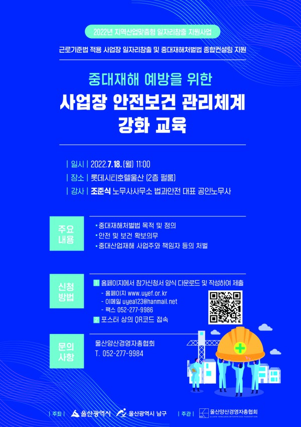 본회에서는 최근 중대재해처벌법 제정 및 단계적 적용과 관련하여 관내 중소기업의 중대재해 예방과 사업장의 안전 경영활동 활성화, 안전역량 제고를 위하여 안전보건 관리체계 강화 교육을 실시하오니 기업의 많은 참여를 바랍니다.